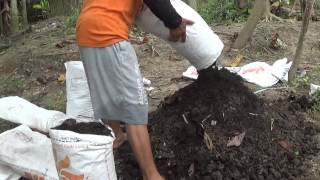 Mencampur tanah pekarangan dan kompos untuk media tanam cabe organik